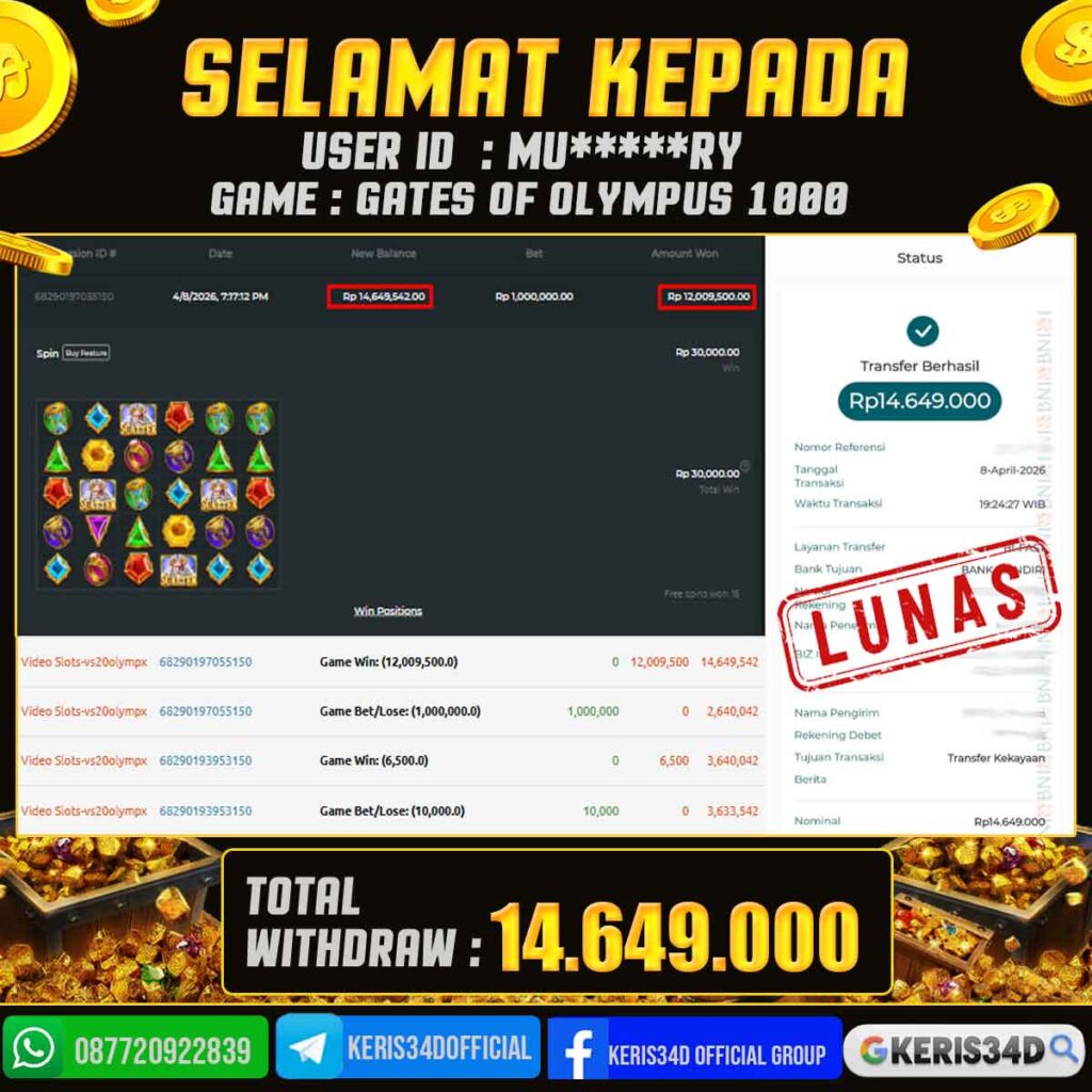 Setiap hari, member KERIS34D berhasil meraih jackpot besar dari berbagai provider slot ternama yang kami sediakan, seperti Pragmatic Play, Habanero, PG Soft, dan masih banyak lagi. Kami secara rutin menampilkan bukti screenshot atau rekapan kemenangan yang berhasil diraih, mulai dari kemenangan ratusan ribu hingga puluhan juta rupiah. Semua slip kemenangan ini kami hadirkan untuk membuktikan bahwa di KERIS34D, peluang menang itu nyata