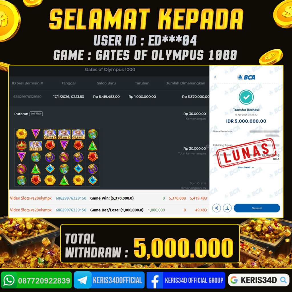 Setiap hari, member KERIS34D berhasil meraih jackpot besar dari berbagai provider slot ternama yang kami sediakan, seperti Pragmatic Play, Habanero, PG Soft, dan masih banyak lagi. Kami secara rutin menampilkan bukti screenshot atau rekapan kemenangan yang berhasil diraih, mulai dari kemenangan ratusan ribu hingga puluhan juta rupiah. Semua slip kemenangan ini kami hadirkan untuk membuktikan bahwa di KERIS34D, peluang menang itu nyata