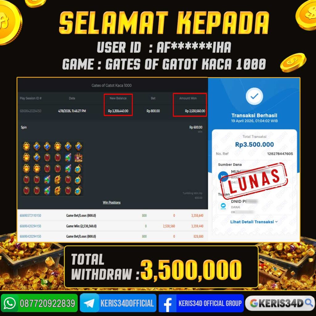 Setiap hari, member KERIS34D berhasil meraih jackpot besar dari berbagai provider slot ternama yang kami sediakan, seperti Pragmatic Play, Habanero, PG Soft, dan masih banyak lagi. Kami secara rutin menampilkan bukti screenshot atau rekapan kemenangan yang berhasil diraih, mulai dari kemenangan ratusan ribu hingga puluhan juta rupiah. Semua slip kemenangan ini kami hadirkan untuk membuktikan bahwa di KERIS34D, peluang menang itu nyata