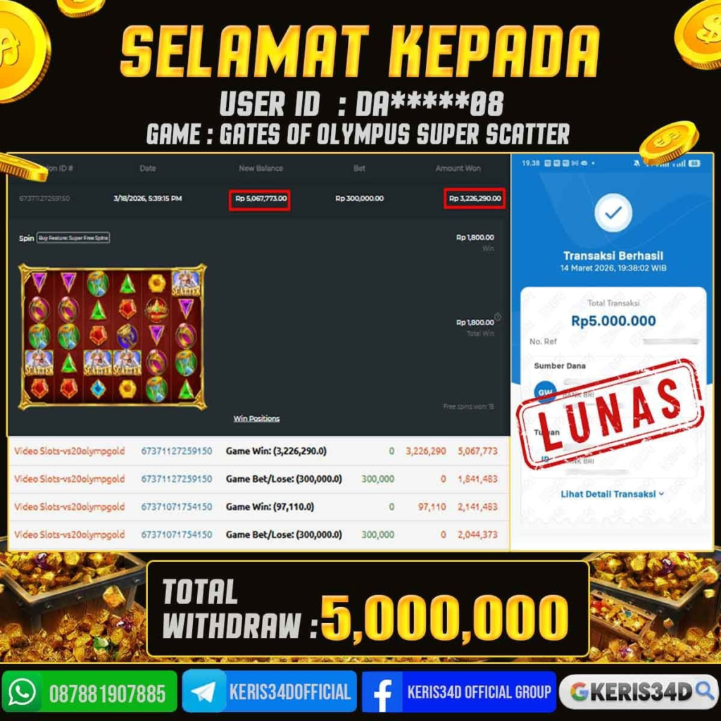 KERIS34D dikenal sebagai situs terpercaya yang selalu menghadirkan pengalaman bermain slot online yang aman, fair, dan berlisensi resmi. Di sini, kami tidak hanya sekadar memberikan janji, tapi bukti nyata berupa slip kemenangan yang dapat Anda lihat secara langsung.