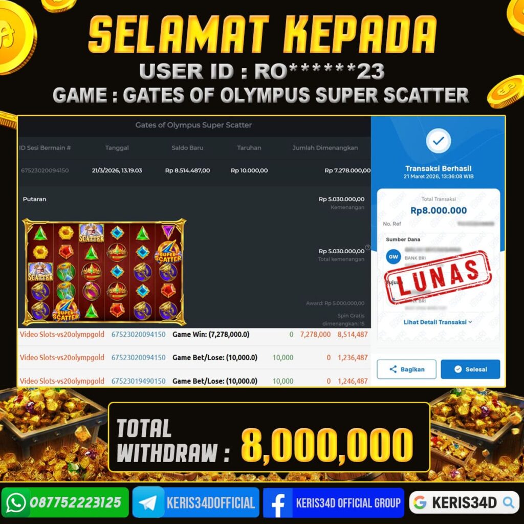 KERIS34D dikenal sebagai situs terpercaya yang selalu menghadirkan pengalaman bermain slot online yang aman, fair, dan berlisensi resmi. Di sini, kami tidak hanya sekadar memberikan janji, tapi bukti nyata berupa slip kemenangan yang dapat Anda lihat secara langsung.