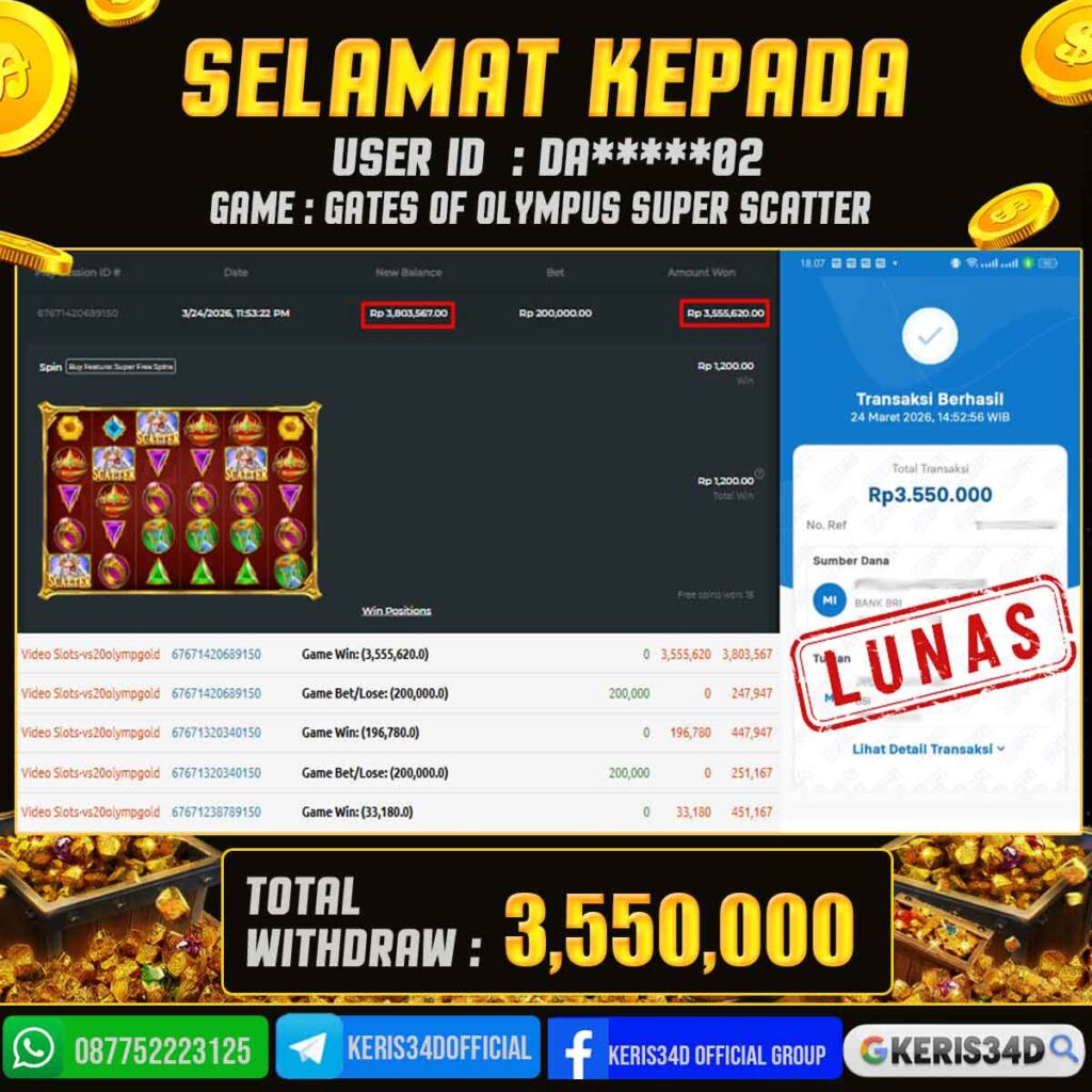 KERIS34D dikenal sebagai situs terpercaya yang selalu menghadirkan pengalaman bermain slot online yang aman, fair, dan berlisensi resmi. Di sini, kami tidak hanya sekadar memberikan janji, tapi bukti nyata berupa slip kemenangan yang dapat Anda lihat secara langsung.