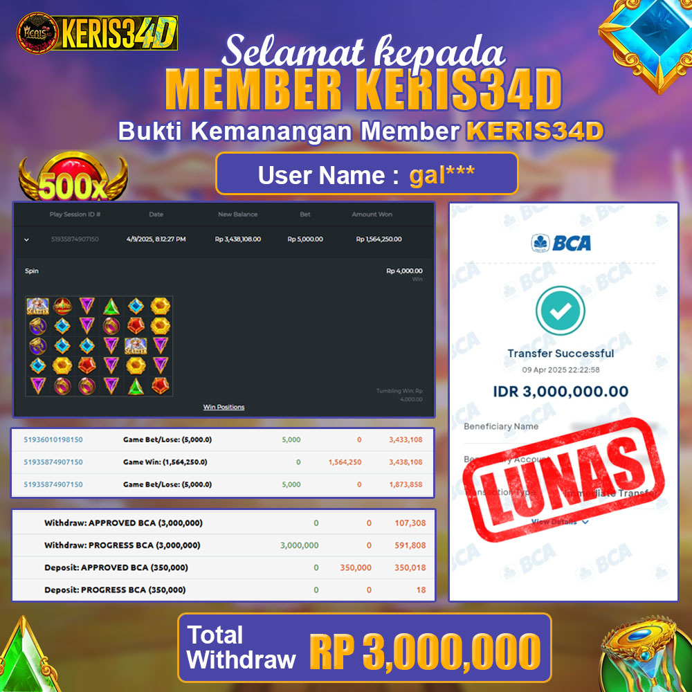 Setiap hari, member KERIS34D berhasil meraih jackpot besar dari berbagai provider slot ternama yang kami sediakan, seperti Pragmatic Play, Habanero, PG Soft, dan masih banyak lagi. Kami secara rutin menampilkan bukti screenshot atau rekapan kemenangan yang berhasil diraih, mulai dari kemenangan ratusan ribu hingga puluhan juta rupiah. Semua slip kemenangan ini kami hadirkan untuk membuktikan bahwa di KERIS34D, peluang menang itu nyata
