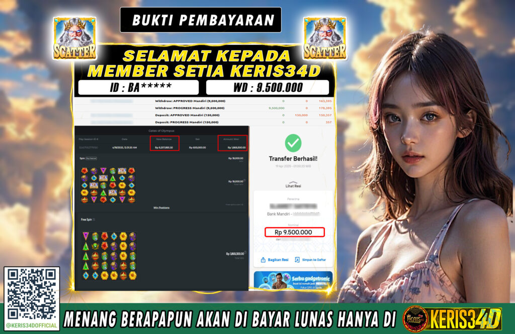 KERIS34D dikenal sebagai situs terpercaya yang selalu menghadirkan pengalaman bermain slot online yang aman, fair, dan berlisensi resmi. Di sini, kami tidak hanya sekadar memberikan janji, tapi bukti nyata berupa slip kemenangan yang dapat Anda lihat secara langsung.