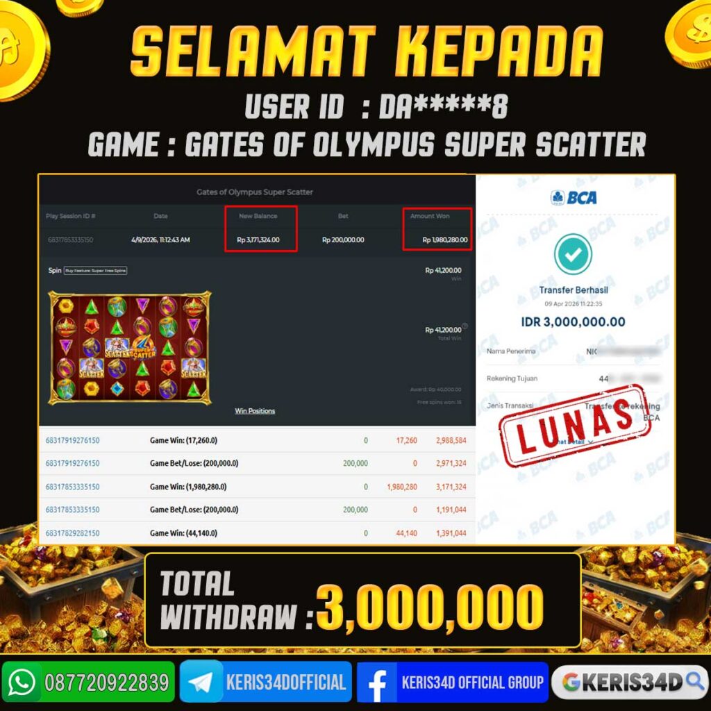 Setiap hari, member KERIS34D berhasil meraih jackpot besar dari berbagai provider slot ternama yang kami sediakan, seperti Pragmatic Play, Habanero, PG Soft, dan masih banyak lagi. Kami secara rutin menampilkan bukti screenshot atau rekapan kemenangan yang berhasil diraih, mulai dari kemenangan ratusan ribu hingga puluhan juta rupiah. Semua slip kemenangan ini kami hadirkan untuk membuktikan bahwa di KERIS34D, peluang menang itu nyata