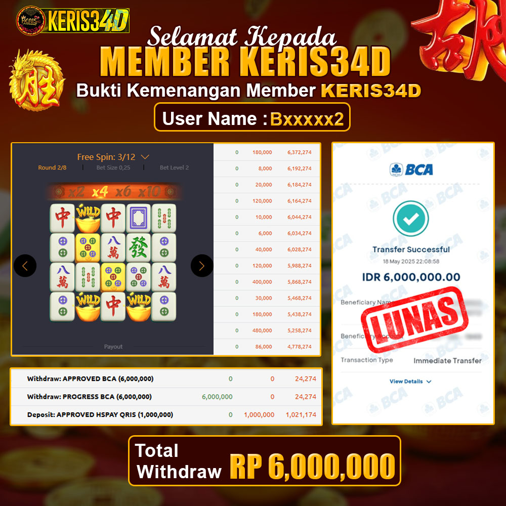 Setiap hari, member KERIS34D berhasil meraih jackpot besar dari berbagai provider slot ternama yang kami sediakan, seperti Pragmatic Play, Habanero, PG Soft, dan masih banyak lagi. Kami secara rutin menampilkan bukti screenshot atau rekapan kemenangan yang berhasil diraih, mulai dari kemenangan ratusan ribu hingga puluhan juta rupiah. Semua slip kemenangan ini kami hadirkan untuk membuktikan bahwa di KERIS34D, peluang menang itu nyata