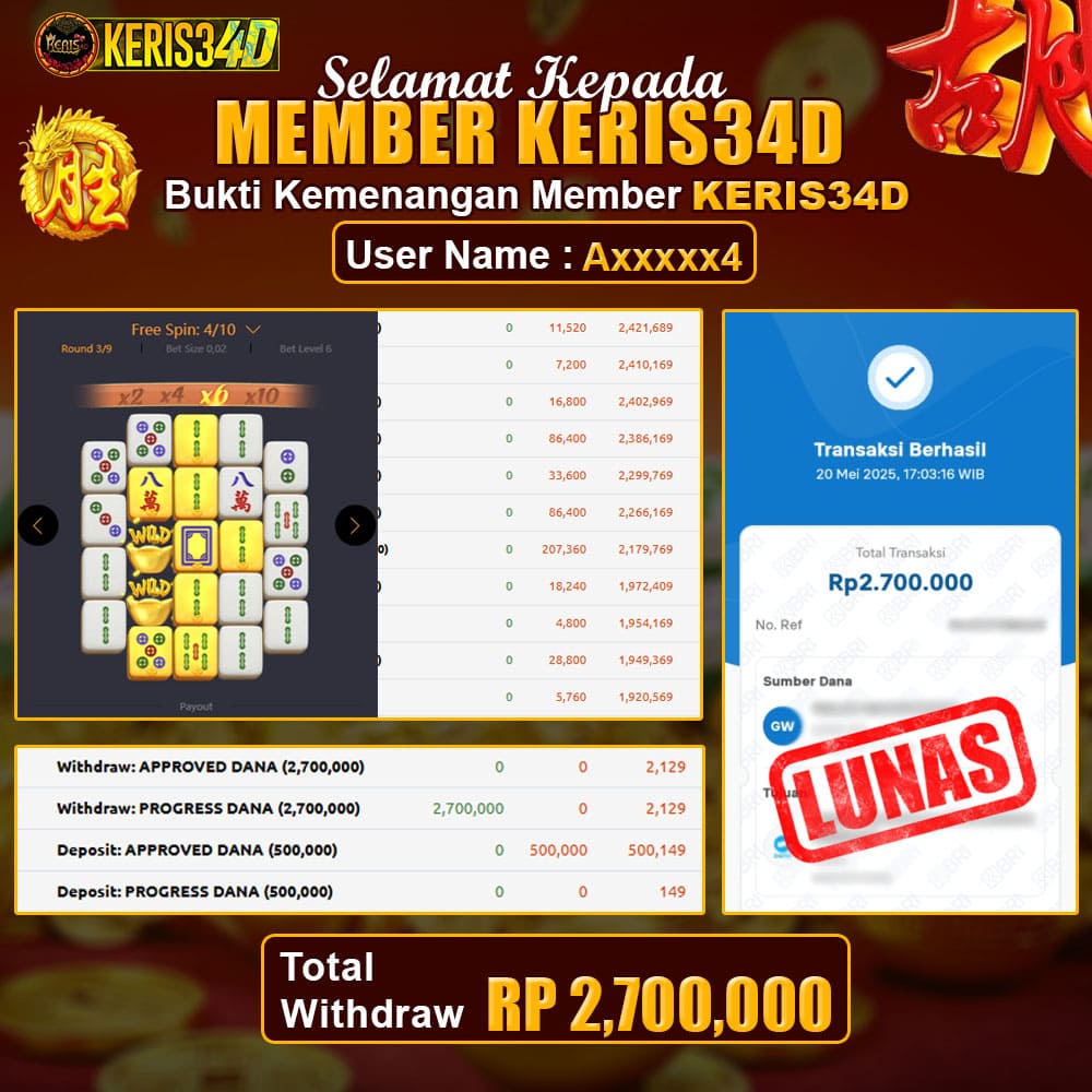 Setiap hari, member KERIS34D berhasil meraih jackpot besar dari berbagai provider slot ternama yang kami sediakan, seperti Pragmatic Play, Habanero, PG Soft, dan masih banyak lagi. Kami secara rutin menampilkan bukti screenshot atau rekapan kemenangan yang berhasil diraih, mulai dari kemenangan ratusan ribu hingga puluhan juta rupiah. Semua slip kemenangan ini kami hadirkan untuk membuktikan bahwa di KERIS34D, peluang menang itu nyata