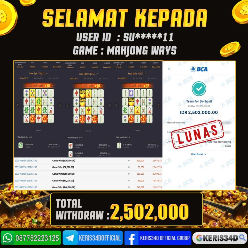 Setiap hari, member KERIS34D berhasil meraih jackpot besar dari berbagai provider slot ternama yang kami sediakan, seperti Pragmatic Play, Habanero, PG Soft, dan masih banyak lagi. Kami secara rutin menampilkan bukti screenshot atau rekapan kemenangan yang berhasil diraih, mulai dari kemenangan ratusan ribu hingga puluhan juta rupiah. Semua slip kemenangan ini kami hadirkan untuk membuktikan bahwa di KERIS34D, peluang menang itu nyata