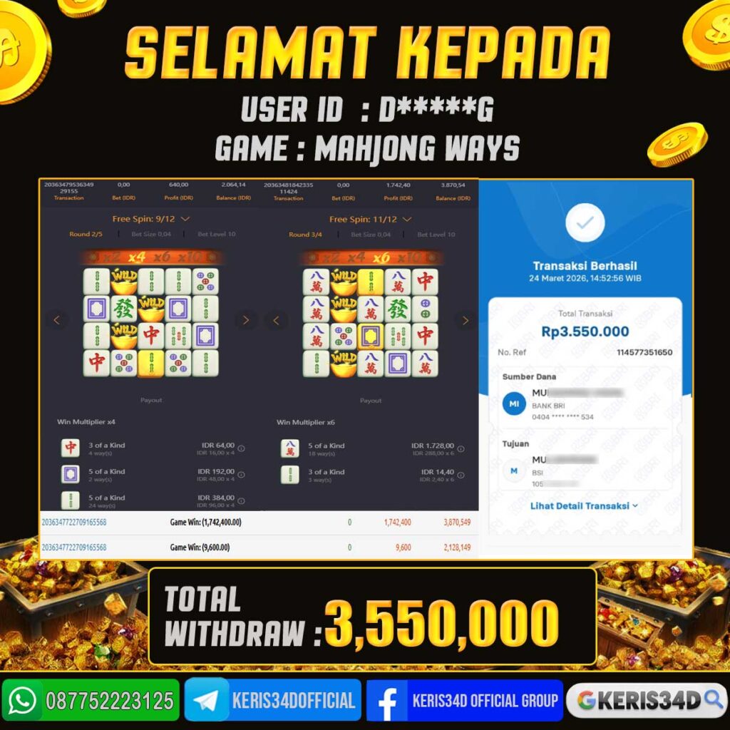 Setiap hari, member KERIS34D berhasil meraih jackpot besar dari berbagai provider slot ternama yang kami sediakan, seperti Pragmatic Play, Habanero, PG Soft, dan masih banyak lagi. Kami secara rutin menampilkan bukti screenshot atau rekapan kemenangan yang berhasil diraih, mulai dari kemenangan ratusan ribu hingga puluhan juta rupiah. Semua slip kemenangan ini kami hadirkan untuk membuktikan bahwa di KERIS34D, peluang menang itu nyata