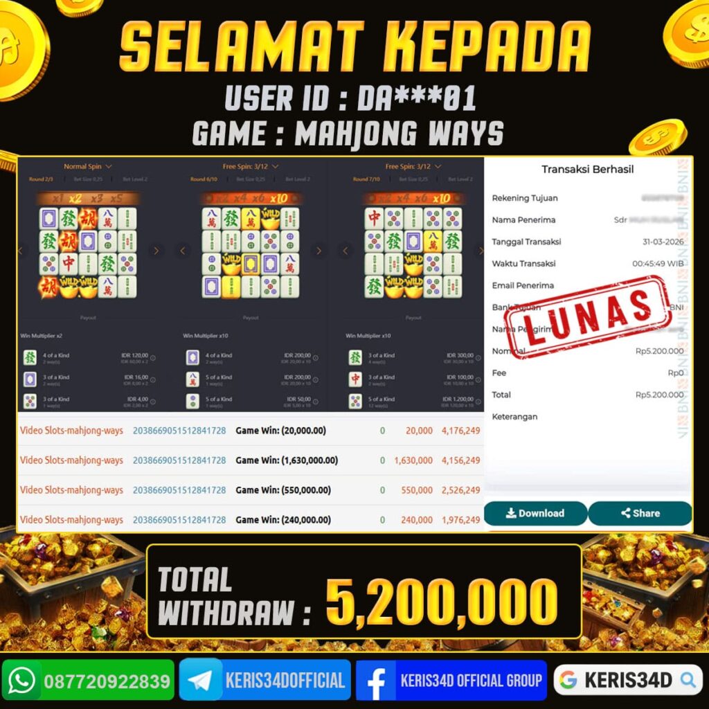 KERIS34D dikenal sebagai situs terpercaya yang selalu menghadirkan pengalaman bermain slot online yang aman, fair, dan berlisensi resmi. Di sini, kami tidak hanya sekadar memberikan janji, tapi bukti nyata berupa slip kemenangan yang dapat Anda lihat secara langsung.