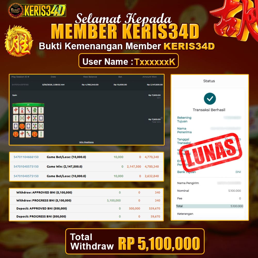 Setiap hari, member KERIS34D berhasil meraih jackpot besar dari berbagai provider slot ternama yang kami sediakan, seperti Pragmatic Play, Habanero, PG Soft, dan masih banyak lagi. Kami secara rutin menampilkan bukti screenshot atau rekapan kemenangan yang berhasil diraih, mulai dari kemenangan ratusan ribu hingga puluhan juta rupiah. Semua slip kemenangan ini kami hadirkan untuk membuktikan bahwa di KERIS34D, peluang menang itu nyata