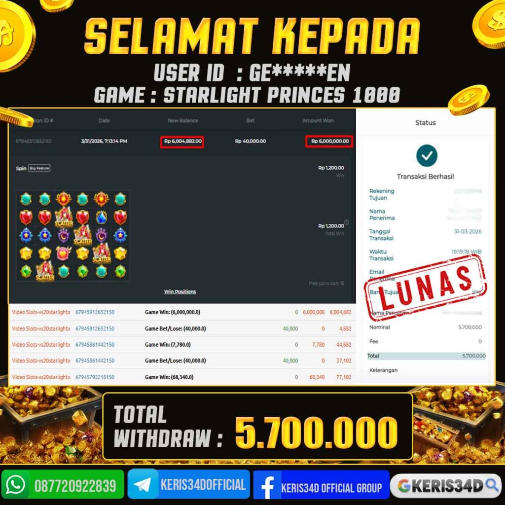 Setiap hari, member KERIS34D berhasil meraih jackpot besar dari berbagai provider slot ternama yang kami sediakan, seperti Pragmatic Play, Habanero, PG Soft, dan masih banyak lagi. Kami secara rutin menampilkan bukti screenshot atau rekapan kemenangan yang berhasil diraih, mulai dari kemenangan ratusan ribu hingga puluhan juta rupiah. Semua slip kemenangan ini kami hadirkan untuk membuktikan bahwa di KERIS34D, peluang menang itu nyata
