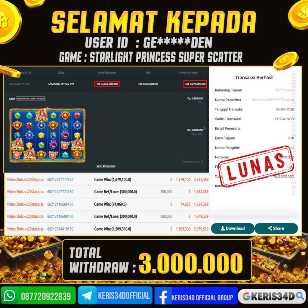 Setiap hari, member KERIS34D berhasil meraih jackpot besar dari berbagai provider slot ternama yang kami sediakan, seperti Pragmatic Play, Habanero, PG Soft, dan masih banyak lagi. Kami secara rutin menampilkan bukti screenshot atau rekapan kemenangan yang berhasil diraih, mulai dari kemenangan ratusan ribu hingga puluhan juta rupiah. Semua slip kemenangan ini kami hadirkan untuk membuktikan bahwa di KERIS34D, peluang menang itu nyata