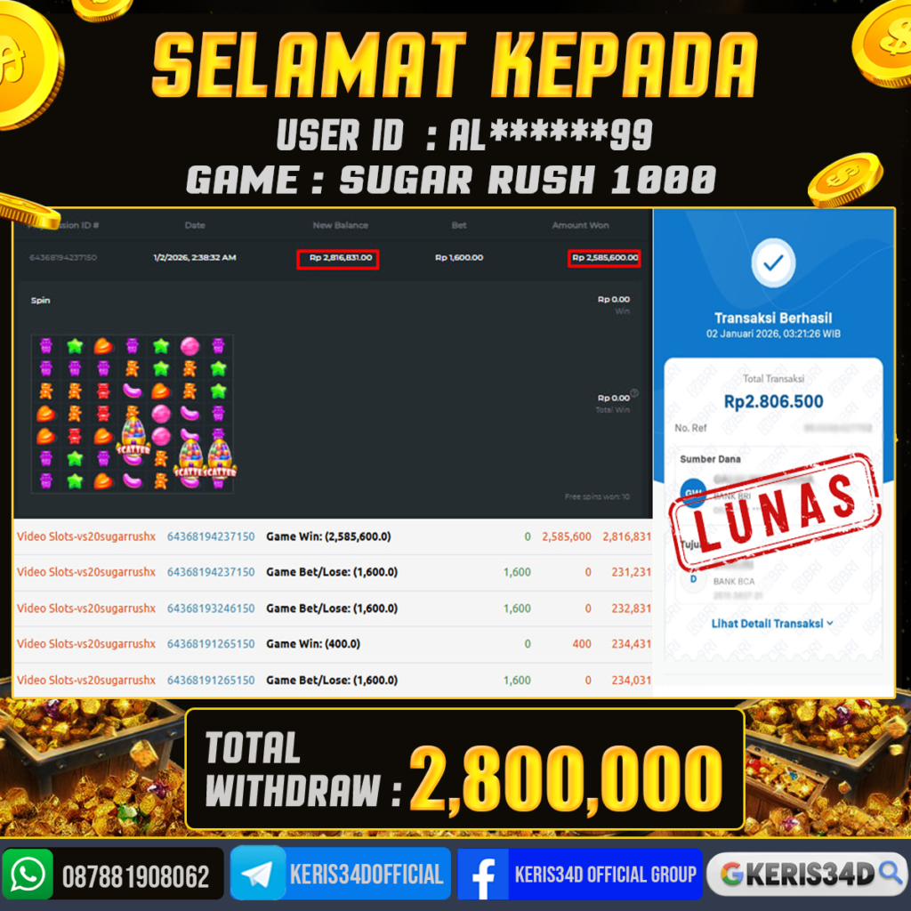 JACKPOT SLOT GACOR SUGAR RUSH 1000 02 JANUARI 2026, Jackpot Slot Gacor, Kemenangan Slot, Bukti Kemenangan Slot, Kemenangan PRAGMATIC PLAY, Menang Slot online, Slot Gacor, Situs Aman Terpercaya, WD Berapapun Pasti DI Bayar Tuntas, Maxwin Slot Online.