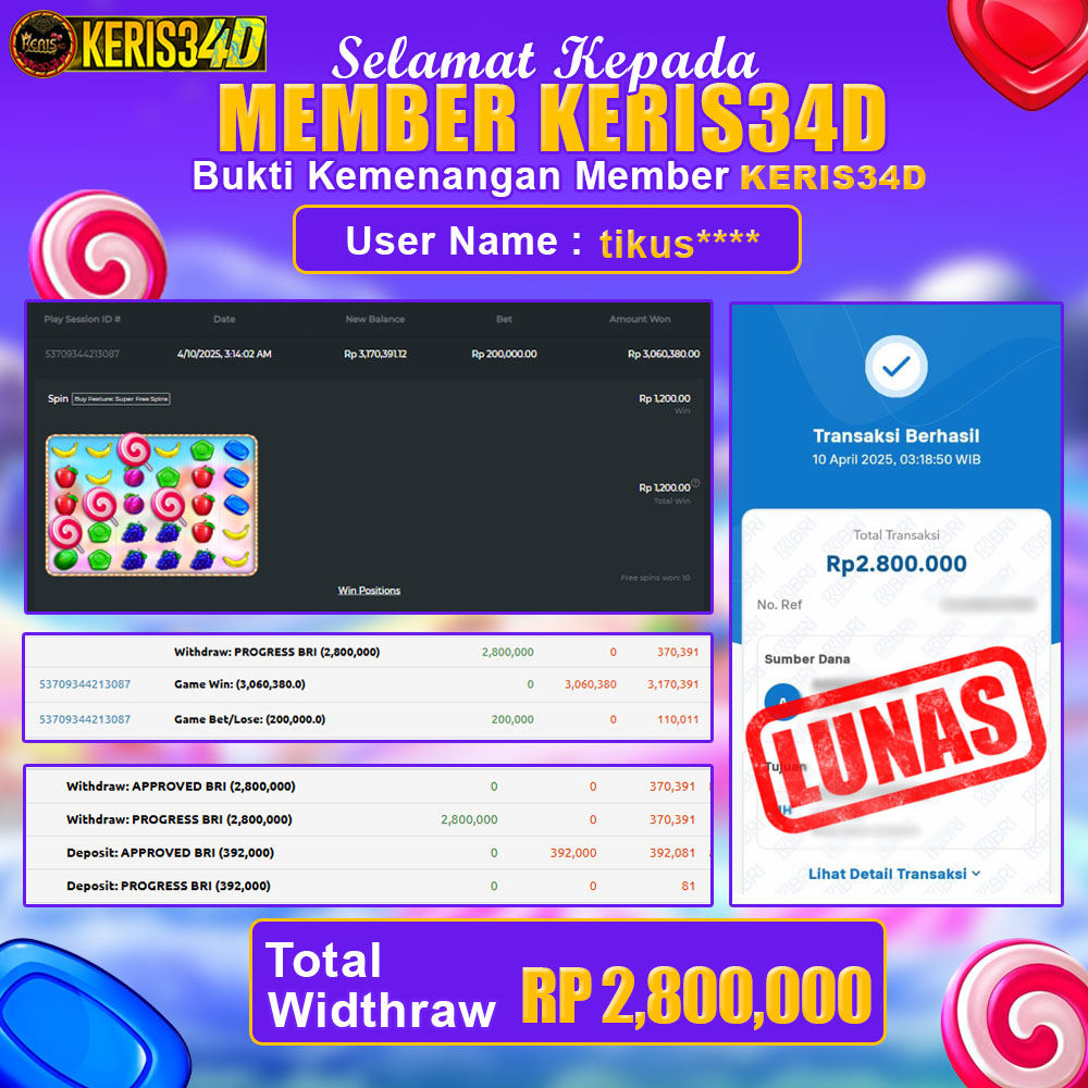Setiap hari, member KERIS34D berhasil meraih jackpot besar dari berbagai provider slot ternama yang kami sediakan, seperti Pragmatic Play, Habanero, PG Soft, dan masih banyak lagi. Kami secara rutin menampilkan bukti screenshot atau rekapan kemenangan yang berhasil diraih, mulai dari kemenangan ratusan ribu hingga puluhan juta rupiah. Semua slip kemenangan ini kami hadirkan untuk membuktikan bahwa di KERIS34D, peluang menang itu nyata