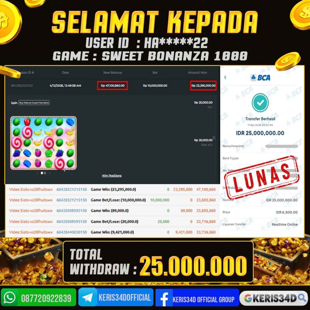 Setiap hari, member KERIS34D berhasil meraih jackpot besar dari berbagai provider slot ternama yang kami sediakan, seperti Pragmatic Play, Habanero, PG Soft, dan masih banyak lagi. Kami secara rutin menampilkan bukti screenshot atau rekapan kemenangan yang berhasil diraih, mulai dari kemenangan ratusan ribu hingga puluhan juta rupiah. Semua slip kemenangan ini kami hadirkan untuk membuktikan bahwa di KERIS34D, peluang menang itu nyata