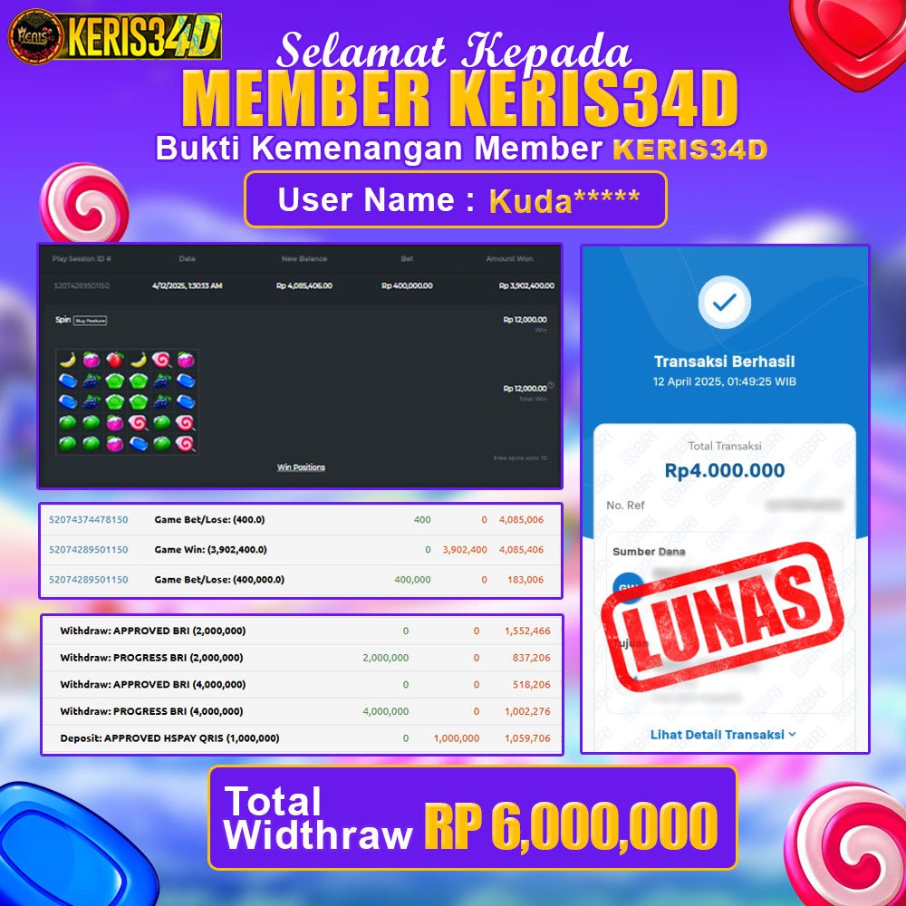 Setiap hari, member KERIS34D berhasil meraih jackpot besar dari berbagai provider slot ternama yang kami sediakan, seperti Pragmatic Play, Habanero, PG Soft, dan masih banyak lagi. Kami secara rutin menampilkan bukti screenshot atau rekapan kemenangan yang berhasil diraih, mulai dari kemenangan ratusan ribu hingga puluhan juta rupiah. Semua slip kemenangan ini kami hadirkan untuk membuktikan bahwa di KERIS34D, peluang menang itu nyata