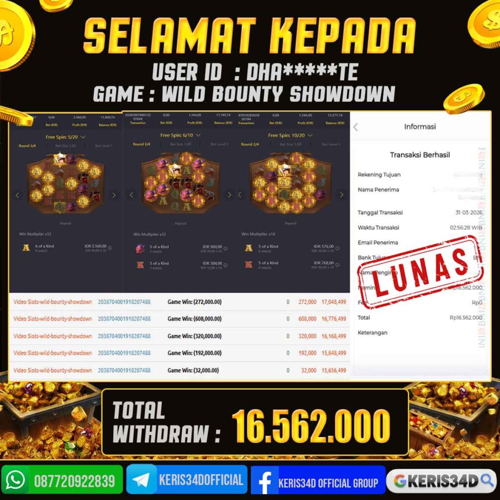 Setiap hari, member KERIS34D berhasil meraih jackpot besar dari berbagai provider slot ternama yang kami sediakan, seperti Pragmatic Play, Habanero, PG Soft, dan masih banyak lagi. Kami secara rutin menampilkan bukti screenshot atau rekapan kemenangan yang berhasil diraih, mulai dari kemenangan ratusan ribu hingga puluhan juta rupiah. Semua slip kemenangan ini kami hadirkan untuk membuktikan bahwa di KERIS34D, peluang menang itu nyata